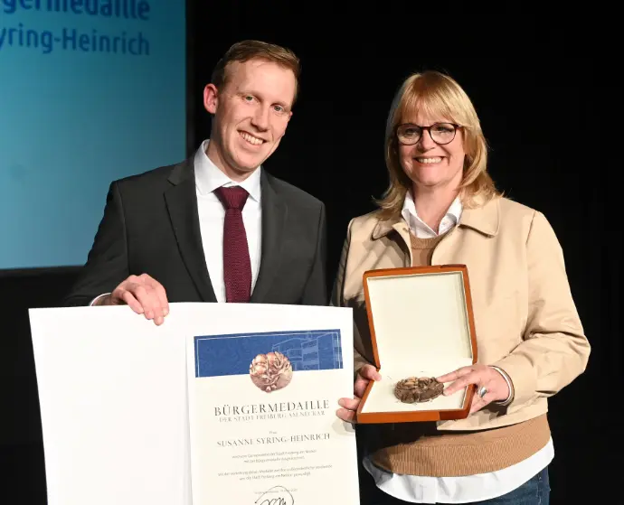 Die Bürgermedaille Freiberg am Neckar: Mit ihrem langjährigen Wirken hat Susanne Syring-Heinrich das psychosoziale Netzwerk in Freiberg nachhaltig bereichert und das Bewusstsein für den Umgang mit psychischen Erkrankungen gestärkt."